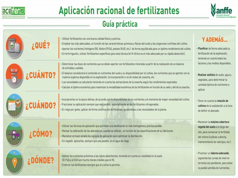 Las asociaciones ANFFE (Asociación Nacional de Fabricantes de Fertilizantes) y ACEFER (Asociación Comercial Española de Fertilizantes), cuya representación agrupa a los fabricantes, comercializadores y distribuidores de fertilizantes a nivel nacional, han elaborado un nuevo póster digital sobre la aplicación racional de los fertilizantes.