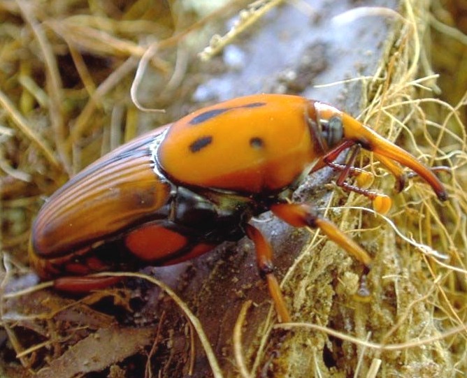 El picudo rojo, conocido como picudo de las palmeras, es originario de las regiones tropicales del Sureste Asiático y Polinesia. Llegó al norte de África a través de Egipto en 1993 y de allí pasó a España,  Italia, Francia y Portugal. El insecto, uno de los más dañinos para las palmeras, sobre todo la canaria y la datilera, ha demostrado una gran capacidad de adaptación a entornos muy diferentes al clima tropical. Vive y se alimenta en el interior de las palmeras, por lo que resulta difícil detectar su presencia a simple vista. Tiene metamorfosis completa y se pueden encontrar los cuatro estadios diferentes conviviendo al mismo tiempo: huevo, larva, pupa y adulto. Por sus características biológicas, una sola palmera infestada puede ser el inicio de un gran foco, ya que en su interior pueden desarrollarse más de mil individuos, solapándose diferentes generaciones y coexistiendo todos los estadios de su ciclo en una misma palmera, llegando a destruirla completamente.