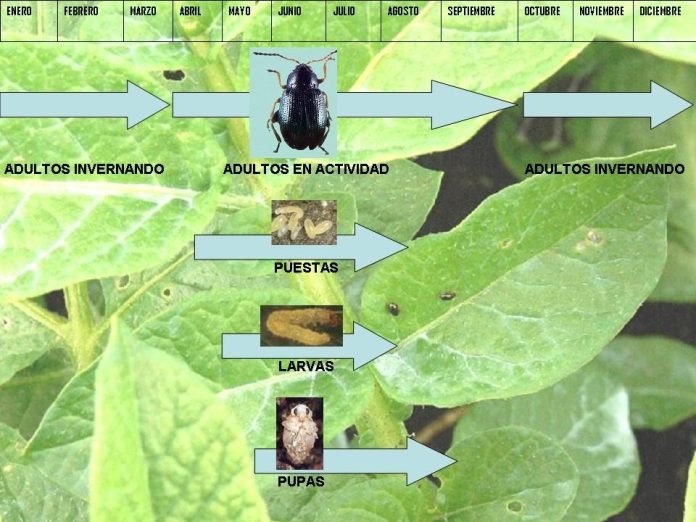 Ciclo Biológico. Los adultos emergen en primavera, después de un período de hibernación en la tierra o en los restos del cultivo anterior. Después del apareamiento y de un período de preoviposición de una duración aproximada de una semana, las hembras comienzan a poner huevos en la base de la planta. Una vez que se ha producido la eclosión de los huevos, las larvas se dirigen al sistema radicular, y empiezan a alimentarse de las raíces y tubérculos durante un período de dos a cuatro semanas hasta completar su desarrollo.