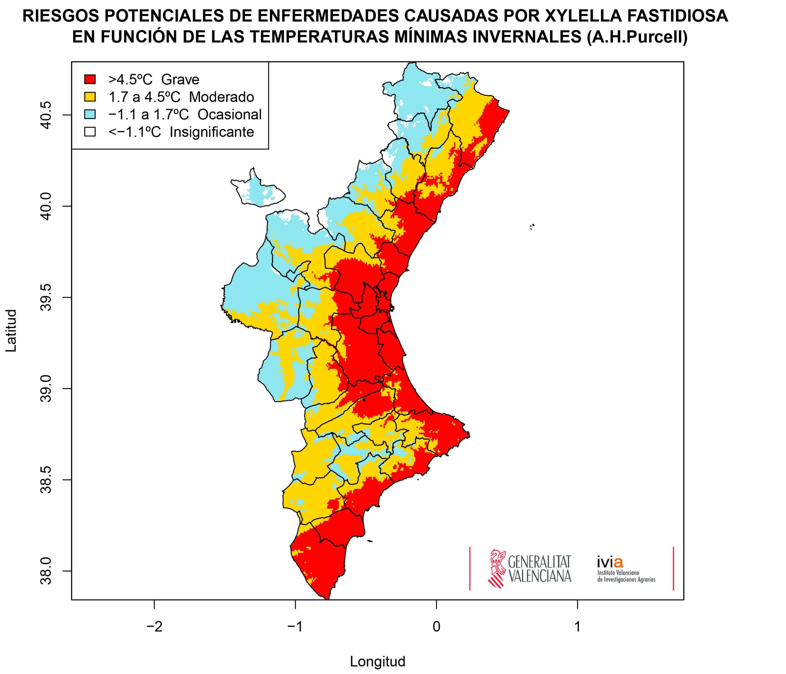 El IVIA ha obtenido los mapas climáticos de riesgos para el desarrollo de enfermedades causadas por X. fastidiosa para todo el territorio de la Comunitat Valenciana, utilizando los criterios del Prof. Purcell. Se ha empleado para ello información de la base de datos WorldClim, con valores promedio de temperatura para el período 1950-2000 interpolados a una resolución de 1 km2.