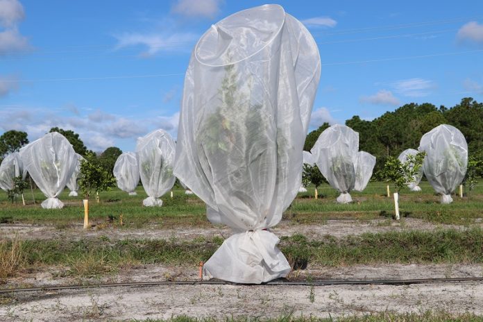 Desde hace dos años, en Florida se ha autorizado el tratamiento con antibióticos vía foliar, método cuya eficacia ponen en duda muchos científicos, entre ellos Alférez, porque no llega suficiente dosis a la bacteria. El biólogo trabaja actualmente en varios proyectos que cuentan con el apoyo de la Citrus Research and Development Foundation, creada en 2009 para coordinar la financiación de la investigación de cítricos frente al HLB. En uno de ellos investigan el uso de mallas que cubren los árboles e impiden el paso del vector, Diaphorina citri.