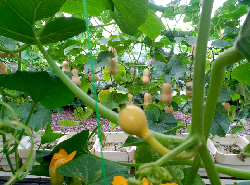 También han podido observarse en los invernaderos experimentales de IFAPA diferentes cultivares de calabazas comerciales de las empresas Sakata y Enza Zaden. Según los expertos, se trata de un cultivo entutorado en red y en momento de máximo cuajado en fase de maduración. La calabaza está en la actualidad ocupando un sector de mercado en el cual los consumidores aprecian su bajo aporte calórico y alto contenido en fibra y vitaminas A y C. Al igual que ocurre con el plátano, destaca su elevado contenido en potasio. Todo ello hace que la calabaza se encuentre entre las denominadas hortalizas para los sectores de consumo belleza y deporte.