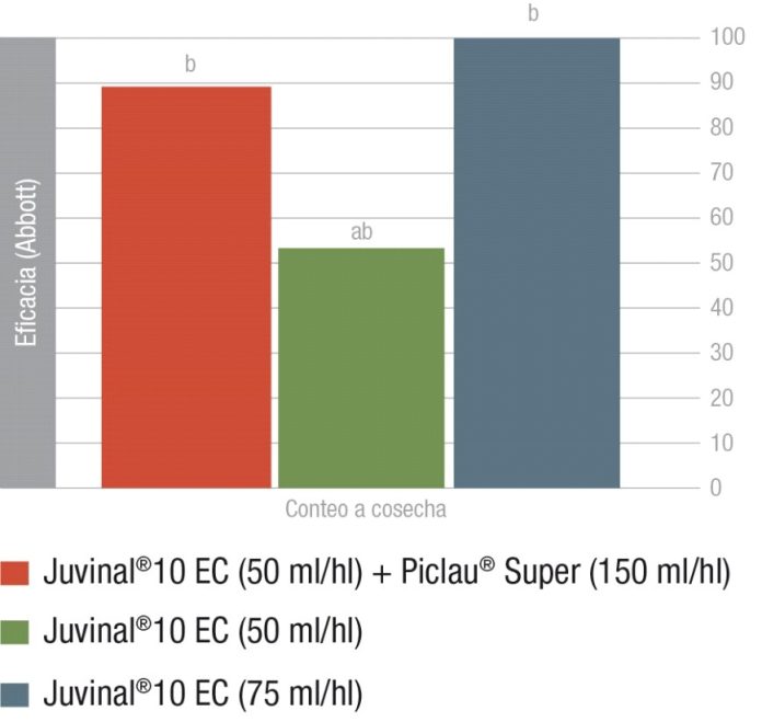 - Igual o superior eficacia a las mezclas con clorpirifos (considerando el % de fruta comercial recolectada).
