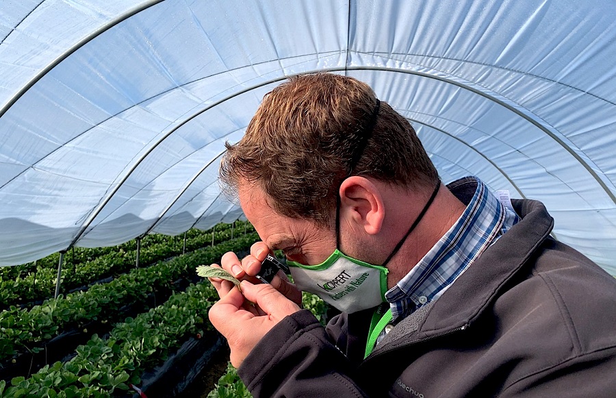 Los adultos de Predanostrum® se han mantenido desde hace semanas dentro de los invernaderos alimentándose de Lobularia y de la flor de la fresa y arándano, patrullando hasta la aparición de los primeros pulgones y contribuyendo además a la polinización de estos cultivos. Con la bajada de las temperaturas y la aparición de los primeros focos, se ha comprobado el gran trabajo de localización y control que realiza este insecto auxiliar. “Los adultos son como drones naturales que patrullan por el invernadero para poner hasta 800 huevos justo en los primeros focos de pulgón. A las pocas horas nacen las larvas, que inmediatamente comienzan a depredar un pulgón tras otro y pueden comer hasta mil pulgones cada una de ellas durante su ciclo de vida”, destaca Gonzalo García, responsable comercial de Koppert en la zona de Huelva.