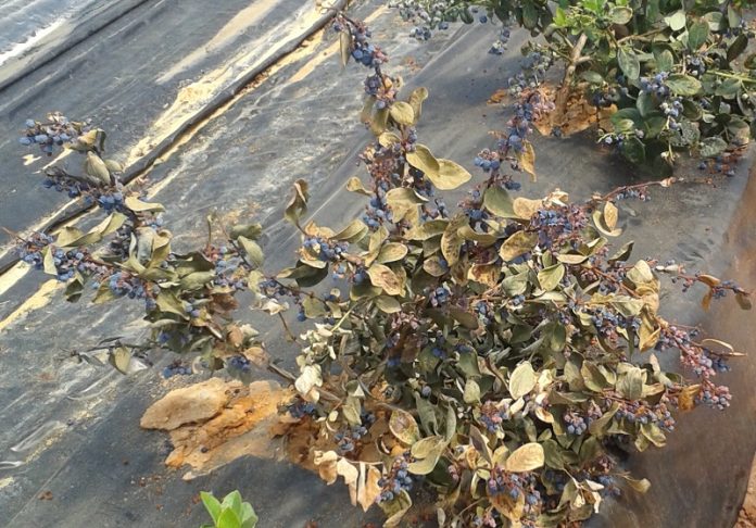 Investigadores del IFAPA Centro Las Torres, el Departamento de Ciencias Agroforestales de la Universidad de Sevilla y el Instituto Nacional de Tecnología Agropecuaria (INTA) de Argentina han detectado por primera vez plantas de arándano afectas por la podredumbre carbonosa en la provincia de Huelva. Las plantas enfermas, recolectadas de tres huertos en los muncipios de Gibraleón y Moguer, corresponden a las variedades ‘Star’, ‘Ventura’ y ‘Legacy’. En ellas se identificó el hongo Macrophomina phaseolina, patógeno de fresa frecuente en esta zona, ya que el arándano generalmente se cultiva en suelos donde la fresa había crecido anteriormente. Esta investigación se ha publicado recientemente en la revista Plant disease.