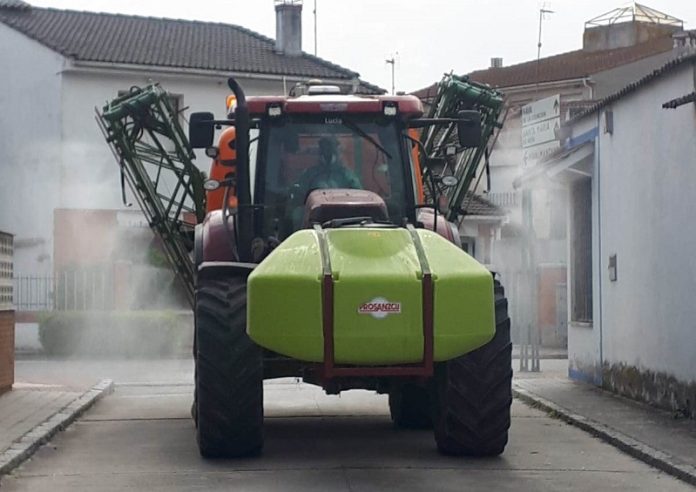 Por todo el territorio nacional, las asociaciones de agricultores se están ofreciendo a las Administraciones para colaborar en las labores de desinfección que se están llevando a cabo en los espacios públicos abiertos por la crisis sanitaria ocasionada por el Covid-19. Desde Almendralejo (Badajoz) hasta Lleida, pasando por Ciudad Real, Toledo, Madrid, La Rioja, Jaén, Málaga o Cádiz, los empresarios agrarios han puesto a disposición de las autoridades competentes sus equipos de maquinaria y su trabajo para ayudar a frenar la propagación del coronavirus, aprovechando su experiencia en la aplicación de productos fitosanitarios.
