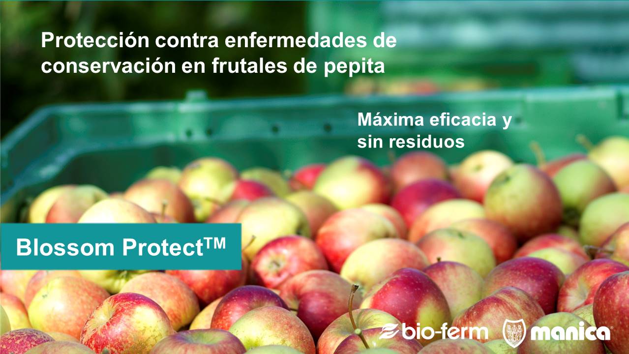 Blossom Protect es un producto biotecnológico de Manica autorizado en agricultura integrada, ecológica y biodinámica para el control de enfermedades post-cosecha provocadas por patógenos como Penicillium sp., Botrytis sp., Gloesporium sp. mediante aplicaciones en campo en frutales de pepita (manzano, membrillero, níspero y peral).