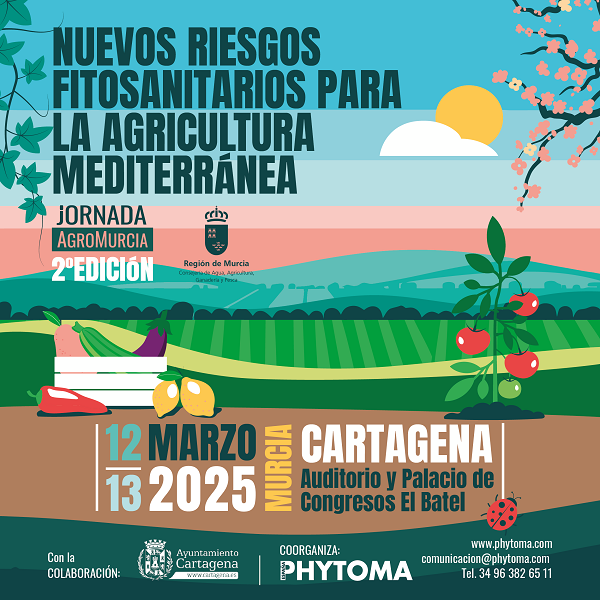 La Consejería de Agua, Agricultura, Ganadería y Pesca de la Región de Murcia y Phytoma presentan el programa definitivo de la segunda edición de AgroMurcia, que convoca a todo el sector, el 12 y 13 de marzo, en el Auditorio y Palacio de Congresos El Batel de Cartagena para analizar y debatir los Nuevos riesgos fitosanitarios para la agricultura mediterránea.