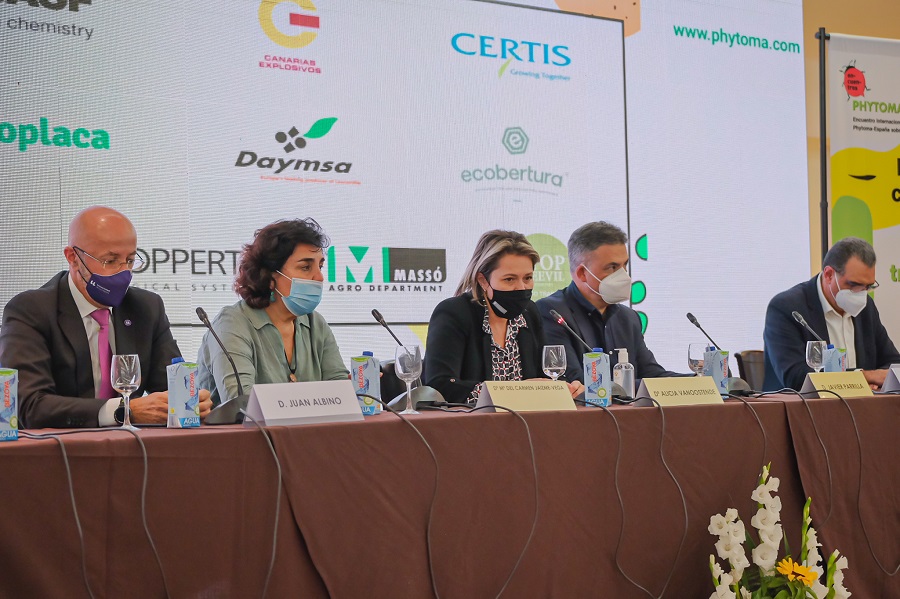 La clausura fue presidida por Alicia Vanoostende, consejera de Agricultura, Ganadería y Pesca de Canarias, que destacó la necesidad de abordar esta transición agroecológica y agradeció el esfuerzo de Phytoma por trasladar un Encuentro Internacional a Tenerife. A la consejera le acompañaron Mª del Carmen Jaizme-Vega, directora científica del Instituto Canario de Investigaciones Agrarias (ICIA) y representante de la Fundación Instituto de Agroecología y sostenibilidad (FIAES); Javier Parrilla, consejero de Agricultura del Cabildo de Tenerife; Juan Albino, vicerrector de Cultura y Participación Social de la Universidad de La Laguna; y Manuel Luis Méndez Martín, teniente de alcalde y concejal del Área de Transición Ecológica, Gestión del Territorio, Desarrollo y Empleo del Ayuntamiento de Adeje. Vannostende no pudo asistir a la inauguración, al coincidor con una visita del ministro Luis Planas a La Palma, pero grabó un mensaje de bienvenida.