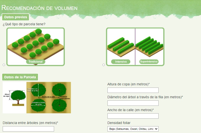 Para poder utilizarla, los productores solo deben indicar algunos datos de la parcela, como el tipo (tradicional o intensiva), la geometría de la copa de los árboles (altura y diámetros), la densidad foliar (alta, media y baja), el marco de plantación y el nivel de poda (alta, media y baja), la plaga o enfermedad a controlar y el producto fitosanitario que se pretende utilizar. Con esta información, la web muestra el volumen recomendado en pulverización continua (l/ha), el volumen recomendado en pulverización con detección de árboles (l/ha) y el ahorro de caldo en la pulverización con detección de árboles.