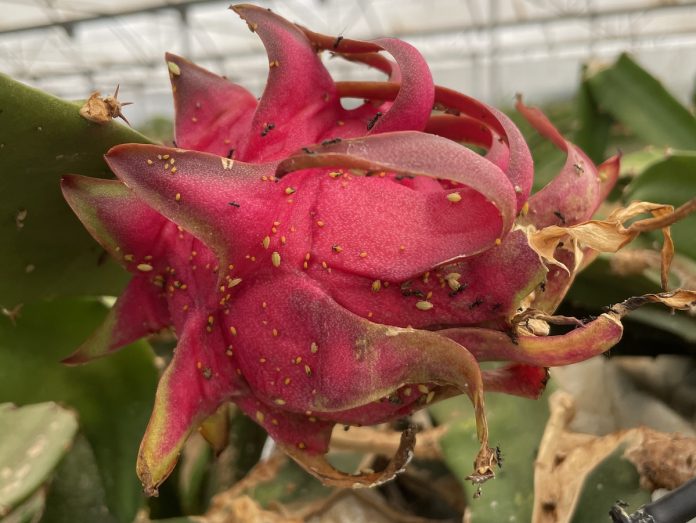 Actualmente se reconocen 17 géneros y 25 especies de agentes fitopatógenos que afectan a la pitaya. En España, el pulgón es la plaga con más incidencia. “Aparece sobre los botones florales, flores y frutos en los que se observan picaduras, manchas (melazo y negrilla) y mudas. Las hormigas realizan una labor de dispersión, pastoreo y protección frente a enemigos naturales, por lo que es importante limitar su acceso al cultivo”, explica Hueso.