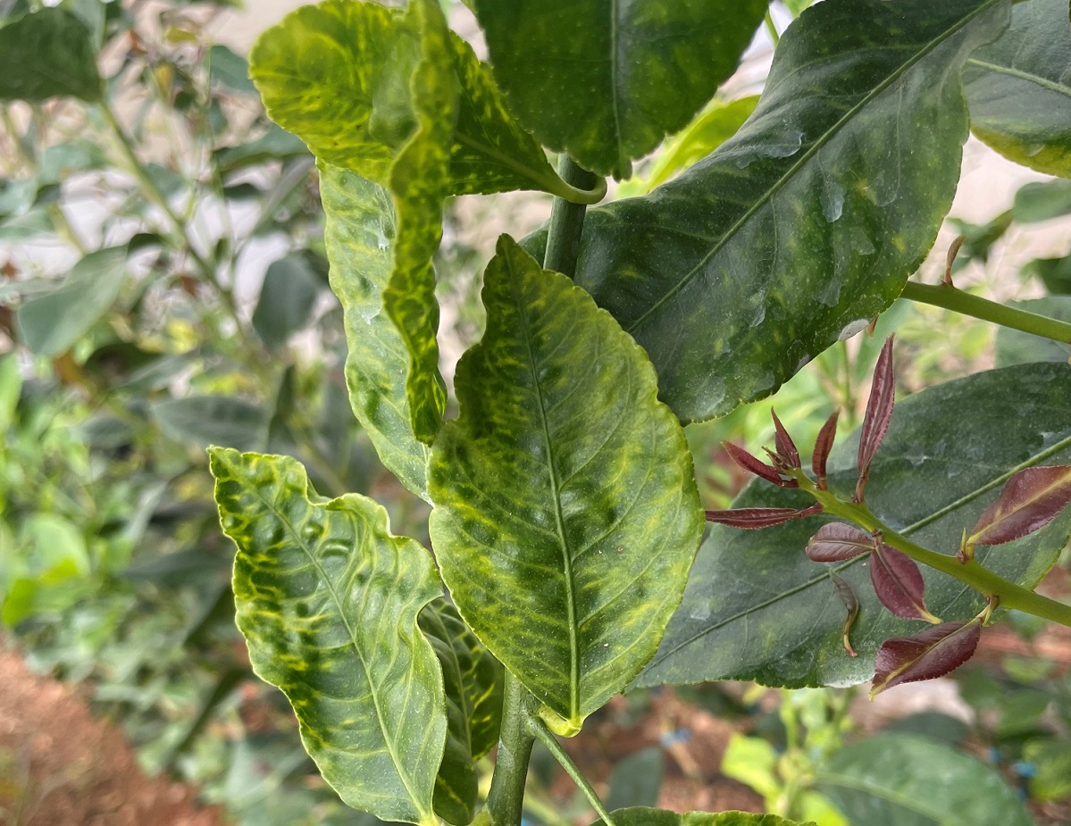 Los síntomas foliares más característicos de CYVCV en limón, limas y naranjo amargo consisten en clorosis muy acentuadas en las nervaduras de las hojas, de color amarillo principalmente en nervaduras secundarias; abolladuras y abarquillamiento de las hojas; ocasionalmente, manchas cloróticas en forma de anillo y oscurecimiento y necrosis de las nervaduras en el envés de las hojas.