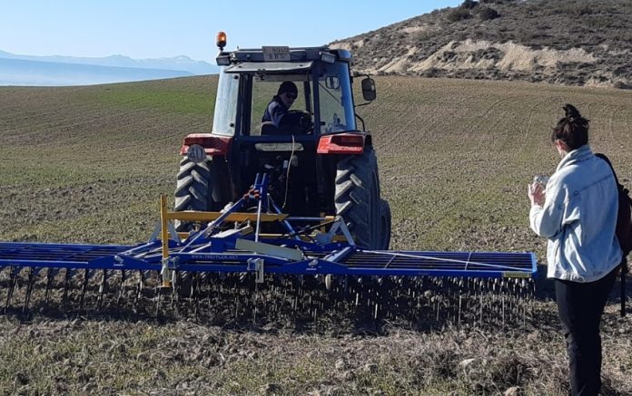 El centro tecnológico navarro lleva años realizando este tipo de pruebas con gradas y binadoras, fundamentalmente en la finca de Sartaguda, pero debido al incremento de superficie de cereal cultivo en ecológico en la zona de la Ribera, y tras el interés mostrado por el sector agrícola de la zona, se decidió invitarles para que comprobar el grado de eficacia de esta grada. En el ensayo realizado en Fustiñana, el apero empleado fue una grada de púas flexible de la firma Treffler. Principalmente, se pretendía observar in situ la efectividad en el control de hierbas adventicias a la vez que se analiza el grado de selectividad en el cultivo. El equipo técnico de experimentación de INTIA realizará un seguimiento de este ensayo con un conteo de hierbas allí donde se ha pasado la grada y la comparativa con la situación de la parcela testigo, donde no ha habido ninguna intervención mecánica.