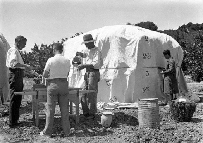 Aunque en torno a 1912 ya había algunas experiencias exitosas y se difundieron publicaciones relacionadas con la fumigación, su grado de penetración en el campo valenciano creció exponencialmente gracias a la labor de la Estación de Patología Vegetal de Valencia. “Por los estudios históricos llevados a cabo por Jesús I. Catalá, Ximo Guillem y Salvador Zaragoza, sabemos que a finales de los años veinte, mientras el laboratorio de entomología de Burjassot desarrollaba experiencias de lucha biológica contra la cochinilla acanalada, el cotonet, o la mosca de la fruta, el laboratorio de terapéutica llevaba a cabo pruebas y cursos de formación para perfeccionar el principal método de lucha química del momento: las fumigaciones cianhídricas”, informa el IVIA.