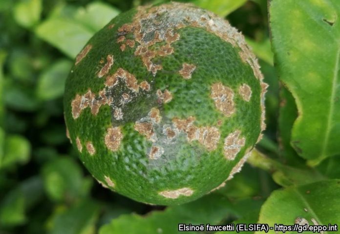 La sarna de los cítricos (citrus scab) afecta a naranjas, mandarinas, pomelos y limones, así como algunos patrones. Está ampliamente distribuida en las zonas citrícolas de América, África, el sudeste asiático y Oceanía, pero no está presente en la citricultura mediterránea. Según explica Antonio Vicent, del Centro de Protección Vegetal y Biotecnología del IVIA, “las sarnas o roñas de los cítricos causadas por Elsinoë spp. se caracterizan por la presencia de costras suberosas en las hojas y la corteza de los frutos. En general, estas lesiones son poco específicas y pueden confundirse fácilmente con daños por viento u otras alteraciones”.