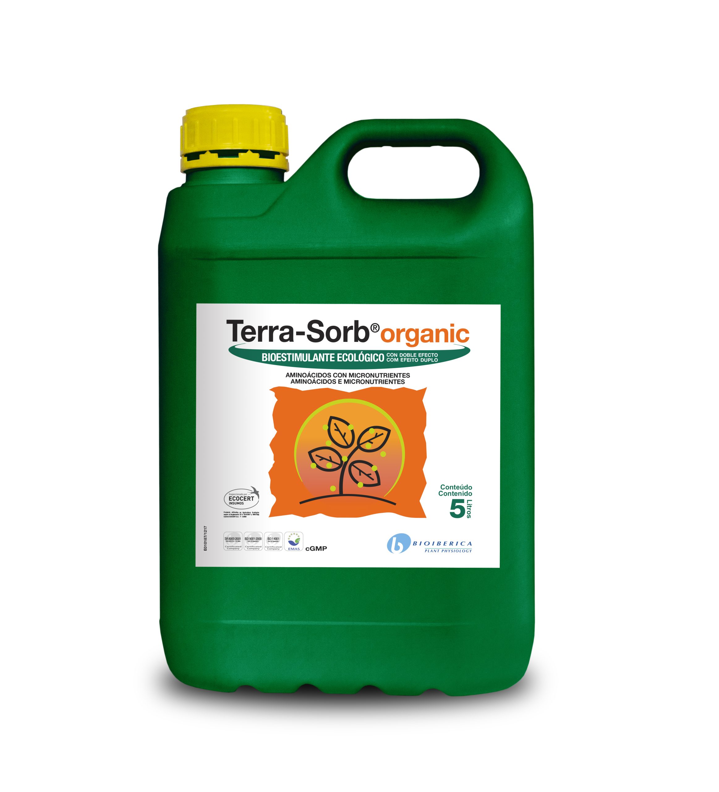 Bioibérica ha lanzado Terra-Sorb® organic, un nuevo bioestimulante concentrado, certificado por ECOCERT como producto utilizable en Agricultura Ecológica (reglamento CE n°834/2007 y 889/2008). Contiene un 20% de L-α-Aminoácidos obtenidos mediante hidrólisis enzimática (un proceso natural y exclusivo de Bioibérica que permite una gestión de los cultivos medioambientalmente segura y compatible con la agricultura ecológica) además de micronutrientes que aumentan la resistencia y la recuperación de los cultivos en situaciones de estrés.