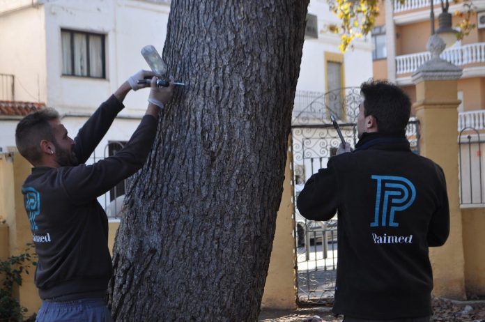 Paimed, empresa del grupo Projar, especializada en jardinería urbana, mejora el control de procesionaria en Carlet (Valencia) con tratamientos preventivos de abamectina, mediante endotorepia.
