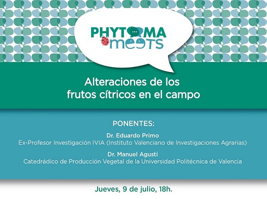 Coincidiendo con la primera entrega, en el próximo número de la revista Phytoma (320, junio-julio 2020), del manual Alteraciones de los frutos cítricos en el campo, este jueves 9 de julio, a las 18 horas, se ha organizado un Phytoma Meet con el Dr. Eduardo Primo, ex profesor de Investigación del Instituto Valenciano de Investigaciones Agrarias (IVIA), y el Dr. Manuel Agustí, Catedrático de Producción Vegetal de la Universidad Politécnica de Valencia (UPV), autores de este trabajo junto al Dr. Salvador Zaragoza, ex profesor de Investigación del IVIA.