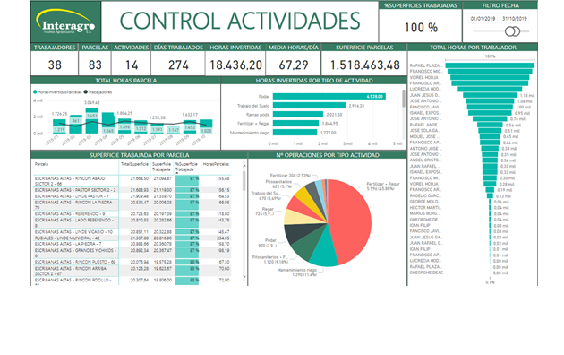 La herramienta, bautizada como Interagro, se basa en la tecnología IoT (internet de las cosas, por sus siglas en inglés), que posibilita la gestión de datos con el uso de Internet mediante dispositivos, tomando como base dos parcelas, una de estudio y otra testigo; a través de sensores, son recogidos y registrados los datos de clima y suelo y serán cruzados con parámetros de kilos de producto y horas de trabajo. Esta plataforma permite generar todos los informes necesarios para la mejora de la planificación y la gestión del olivar.
