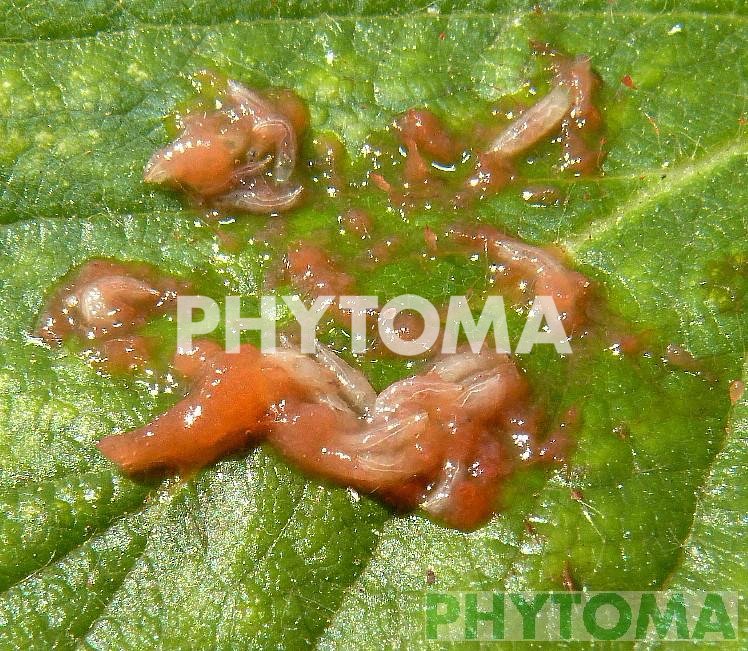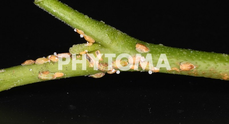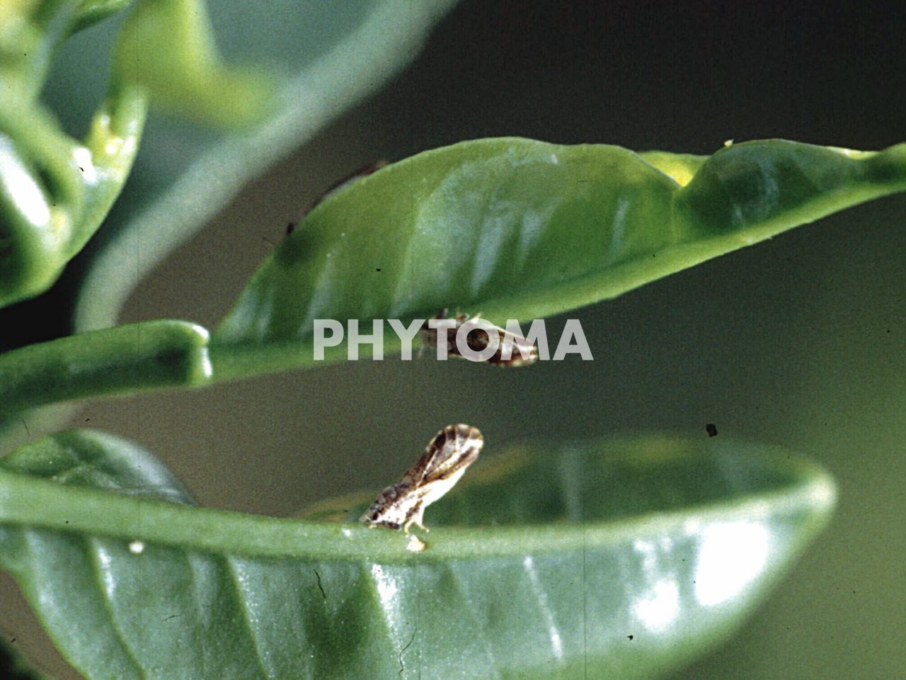 Foto: Adulto y ninfas del psílido asiático de los cítricos, Diaphorina citri.