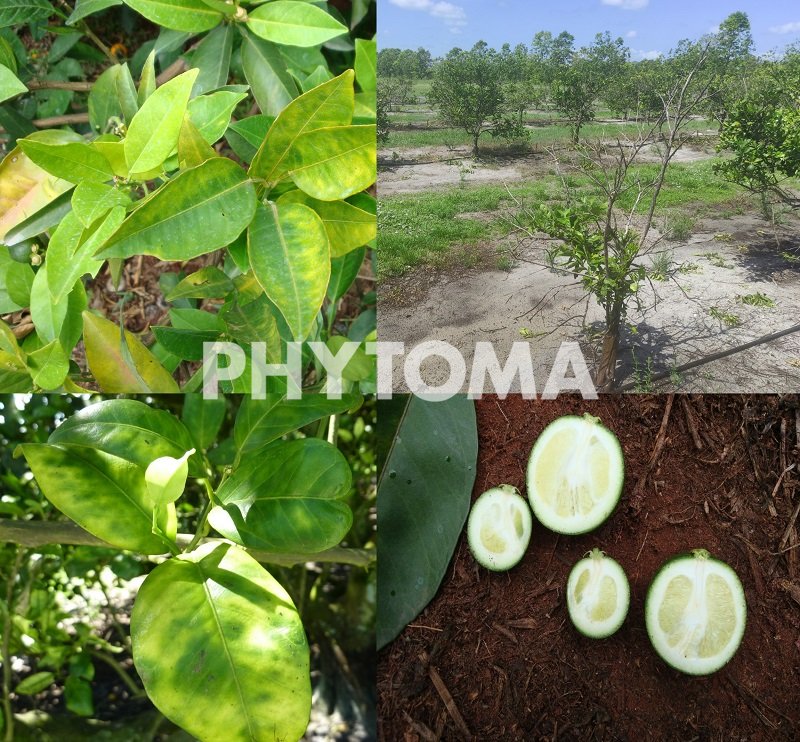 Foto: Síntomas que presentan algunos de los daños que ocasiona el HLB: la elevación del nervio central de la hoja con un aspecto acorchado, la presencia de moteados amarillentos no simétricos en las hojas, brotes secos, tamaño reducido, decoloración y sabor amargo de los frutos, así como caída masiva de frutos.
