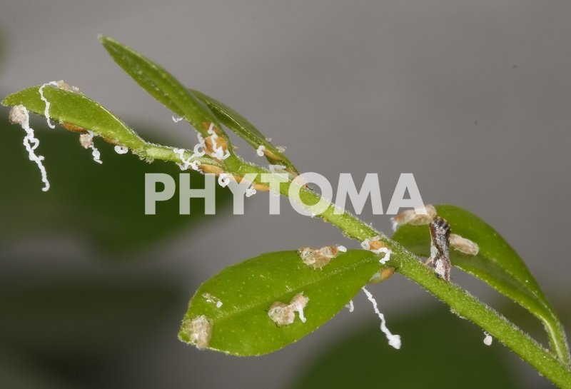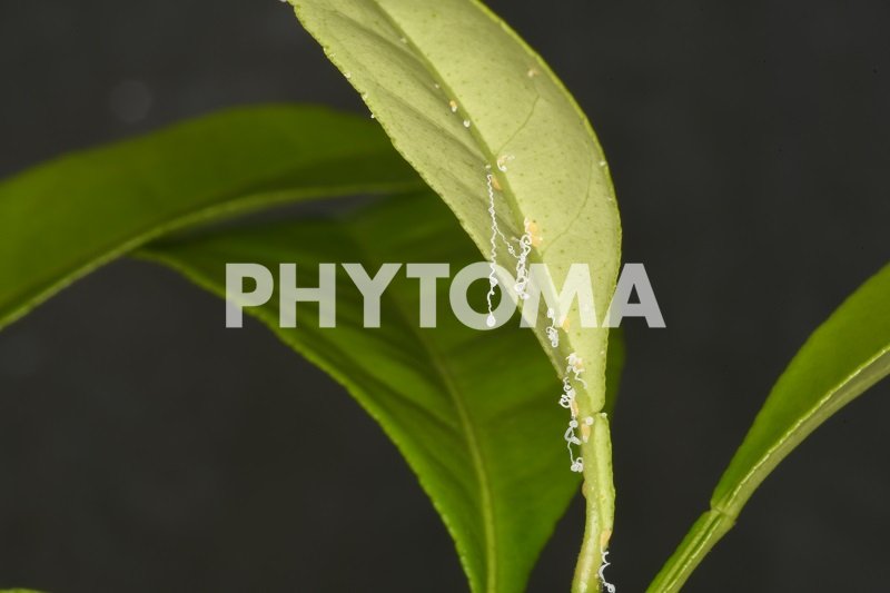 Foto: Filamentos céreos típicos del psílido asiático de los cítricos, Diaphorina citri.