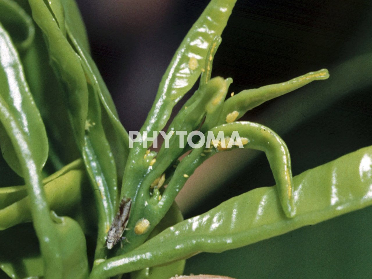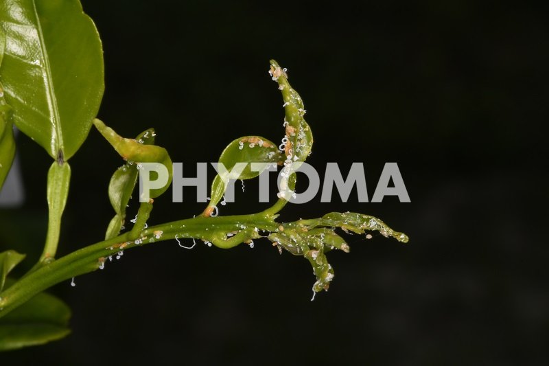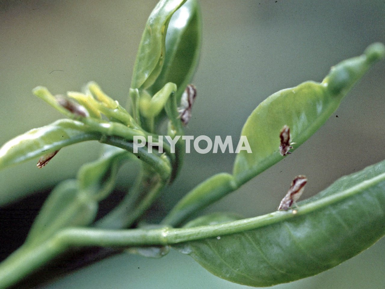 Foto: Infestación severa del psílido asiático de los cítricos, Diaphorina citri, en un brote cítrico donde se observan deformaciones en las hojas tiernas.