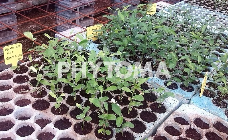 Foto: Plantas del patrón Citrus macrophylla inoculadas en semillero con un inoculo comercial de Glomus spp. (BIOERA) en un sustrato de vivero (bandeja de delante) o en sustrato experimental pobre en nutrientes (bandeja de atrás)